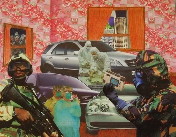 These works come from my Collage series, where I responded to the clash of images of tragedy of current world affairs and luxury products of advertising in local media. At the time I thought about how these issues enter our consciousness and invade our private and personal spaces through various media such as the social media, magazines, newspapers and television, exploring the relationship of consuming world tragedy in the comfort and distance of our safe and removed homes. These works were exhibited at Newcontemporaries Gallery, Sydney, NSW, 2004.