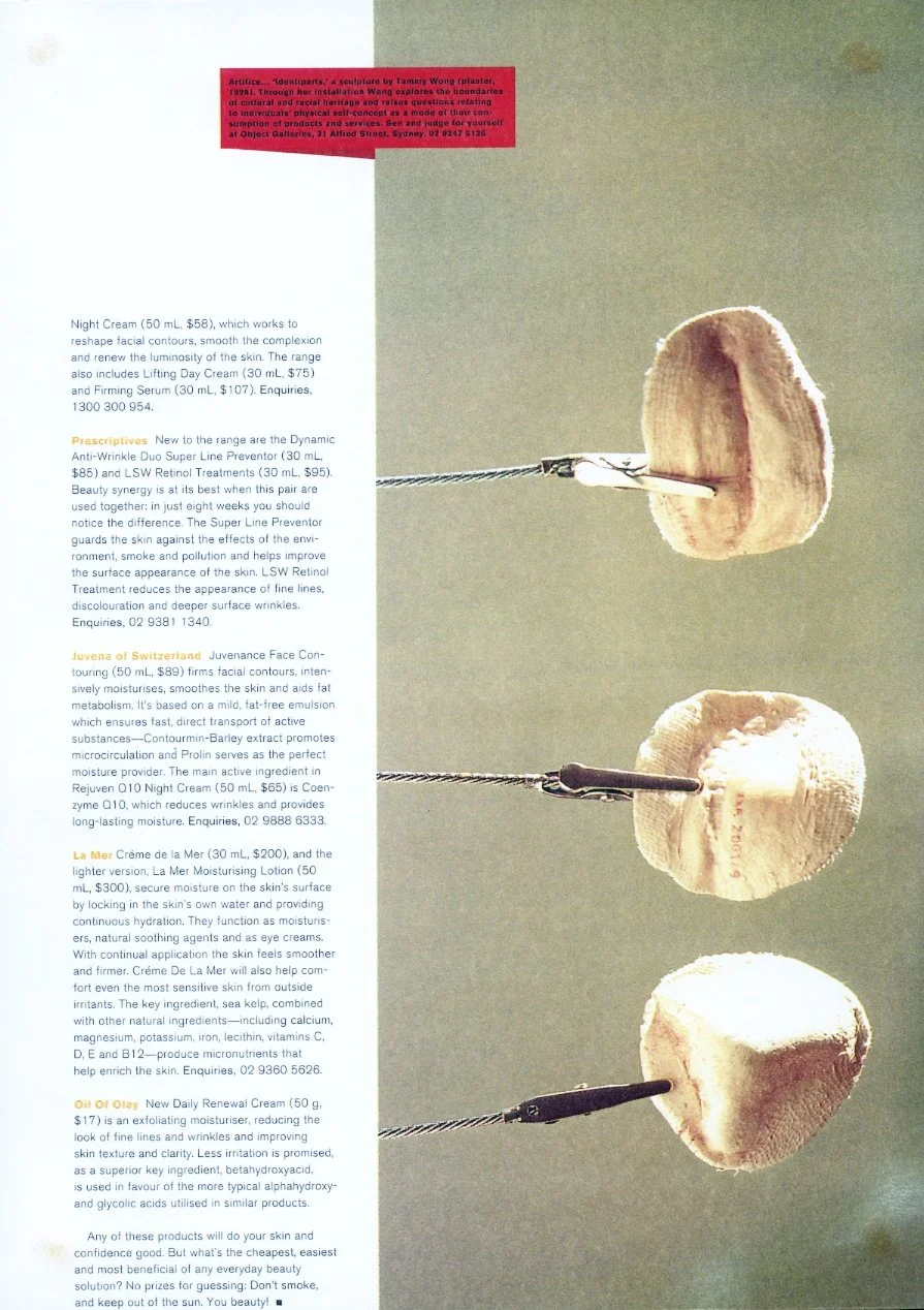 The original work was developed as an object based installation accompanied by an advertising campaign. As the project developed, the work was shown in different sites and contexts. For documentation, the project was placed into the department store site of Myers, Sydney (1998) to give the work a cosmetics context. In King Street Chemist, Newtown, NSW Identiparts was part the Walk in The Streets Art Festival (1999). These early experiments in situ, led to my interest in public and site specific art practices and it's relationship to various audiences.