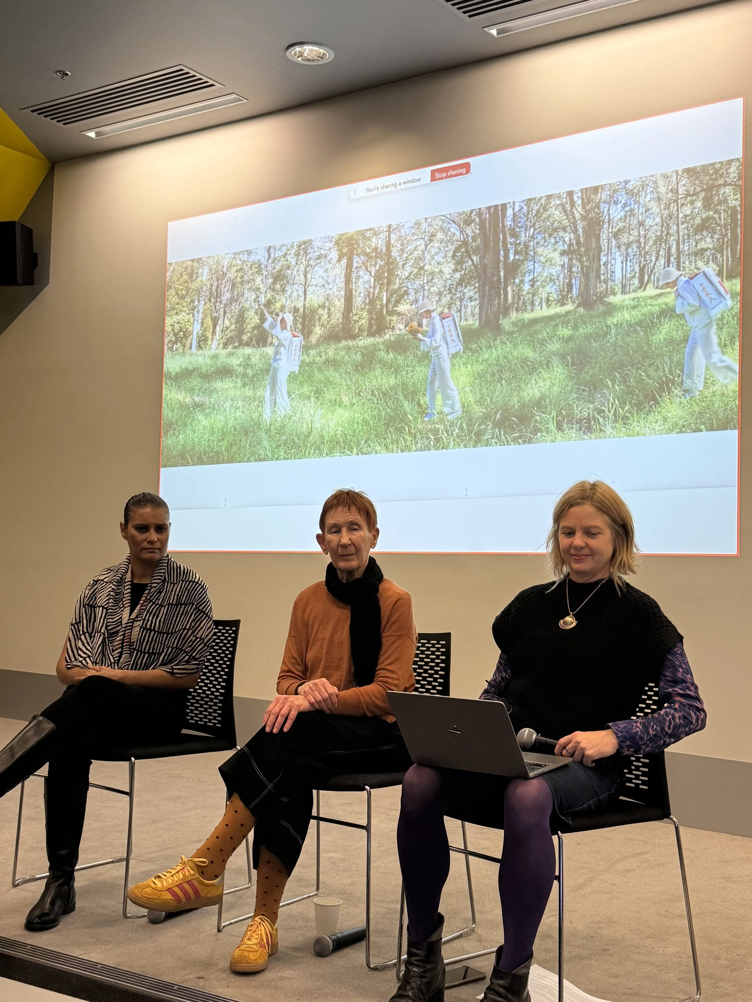 Image: Listening to the Mountain Body, Gulsen Ozer and Aarti Jadu, photo: Fergus Floyd. Below: Place-responsive art and performance now: a panel discussion, RMIT University, June 2025, introduced by Tammy Wong Hulbert (RMIT CAST and Artist) chaired by Gretel Taylor (Curator), featuring Arahmaiani (Indonesia), Rhiannan Port (Lama Lama, Ayapathu and Kuku Yalanji), Jill Orr (Australia), Vicky Hunter (UK).